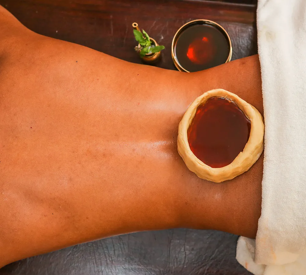 The therapy helps remove toxins, balance Vata Dosha, and nourish internal organs.